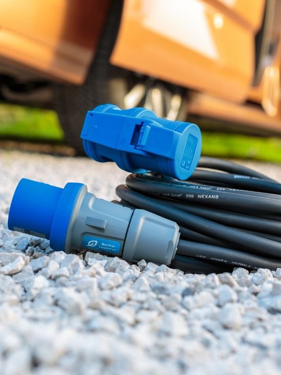 Das Camping Verlängerungskabel ist ein CEE Kabel mit blauem CEE-Stecker und -Steckdose. Das Kabel des CEE Kabel darf nicht länger als 25m. Es muss vom Typ H07RN-F oder gleichwertig sein und benötigt mindestens einen Leiterquerschnitt von 2,5mm2.