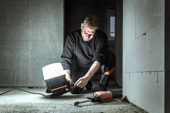 The extremely robust and industrial LED Site Light ORUM with an output of 97 W is perfect for permanent outdoor use thanks to the IP54 protection rating and the oil-resistant 5 m cable. The LED work light provides wide-area all-round illumination thanks to a 360° beam angle and thus ensures ideal room illumination with glare-free work light. The portable LED light can be operated standing, hanging or mounted on a tripod and operated via the on/off switch. In addition, it convinces with the following features: