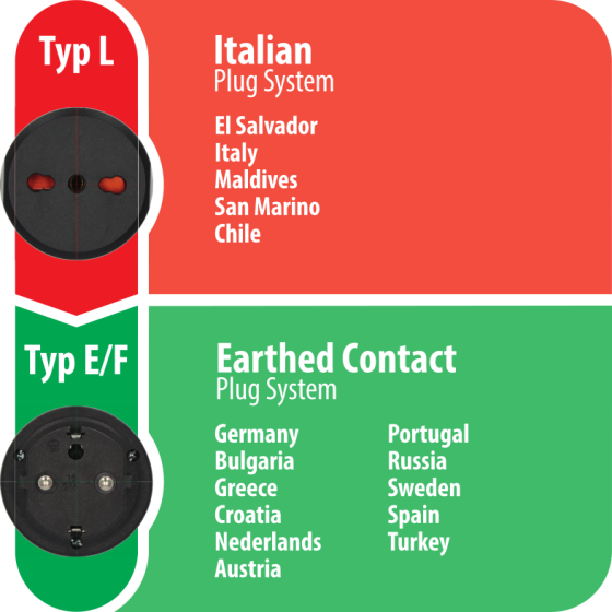 - Adapter for connecting electrical devices with Italian plug system in countries with earthing contact plug systems such as DE, FR, BE, CZ, PL, NL, ES, PT, SE, FI, NO, GR, TR, AT ... (Please note that there are sometimes several plug systems in different countries and Brennenstuhl does not guarantee that the travel plug is suitable for all plug systems in a country)