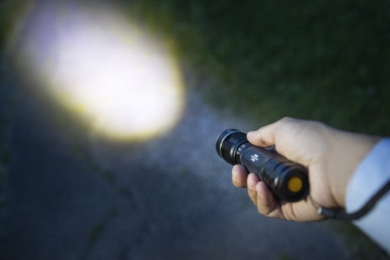 The LuxPremium LED flashlight with high-quality focus function and a high light output offers extremely bright light through its CREE LED, which can be easily adjusted by a switch with soft-touch function (100% - 40% - 10% - SOS). Thanks to the stepless focus, the rechargeable torch can be adjusted from a small spot light to high beam focused light. The robust LED torch with integrated Li-Ion battery (3.7V/2.6Ah and integrated charge indicator) is dust- and waterproof thanks to the IP67 protection class and also has the following features: