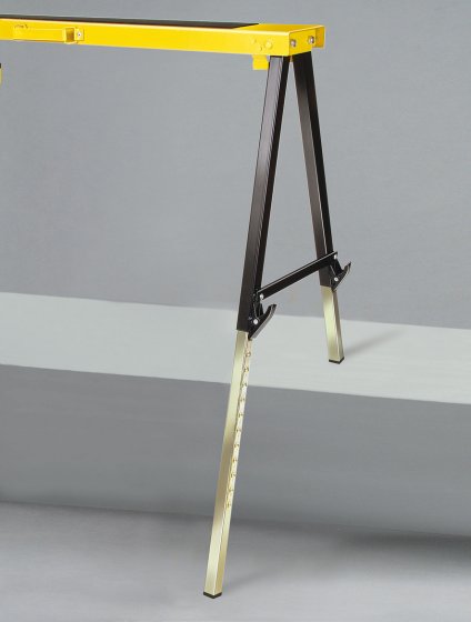 The extremely stable and sturdy folding work trestle is perfect for painting work, interior finishing work or even everyday work in the workshop. Each foot is individually height-adjustable (up to 83 cm high) via a quick release device, allowing flexible working on the spot. The foldable metal trestle is especially perfect on stairs, due to its feet with protective caps. It is impact and scratch resistant and also folds easily, perfect for space-saving storage. The practical carrying handle also allows easy and effortless transport . Furthermore, the scaffolding trestle convinces with the following features: