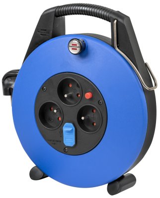 Enrouleur de câble Confort-Line CL-X / Petit enrouleur avec 4 prises de courant électrique (10m H05VV-F 3G1,0, disjoncteur, bouton tournant, crochet, en intérieur, fabriqué en France) noir/bleu
