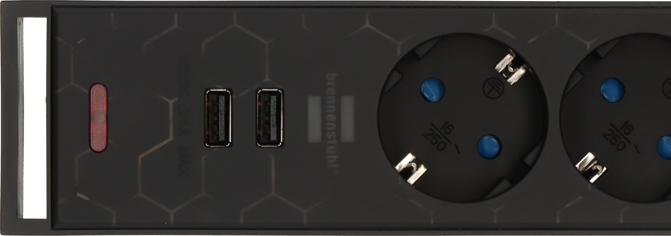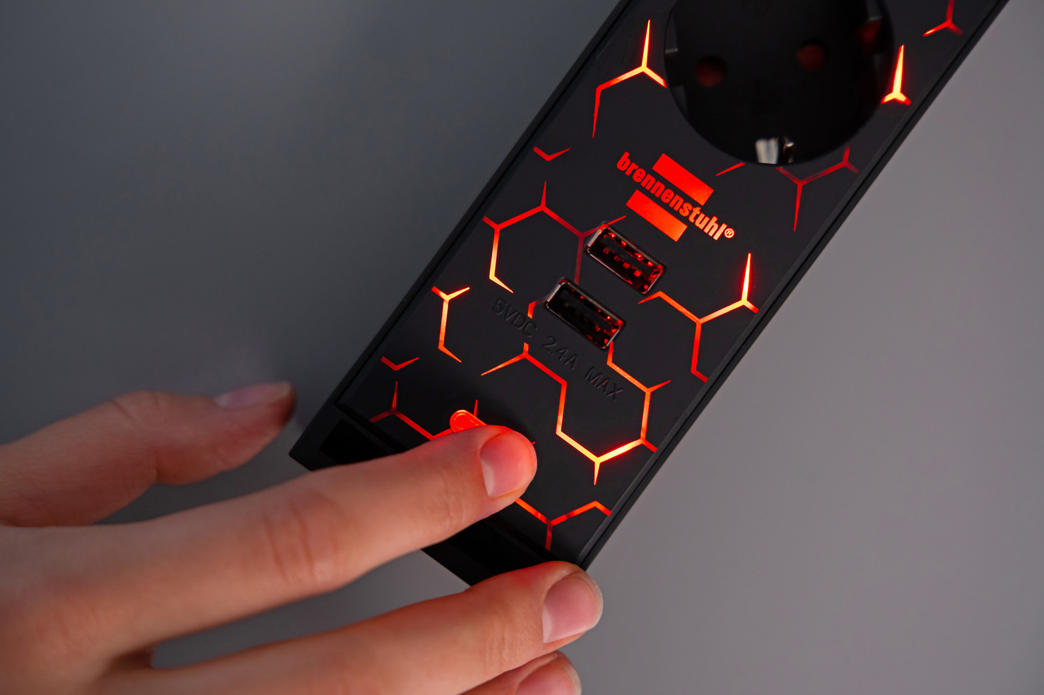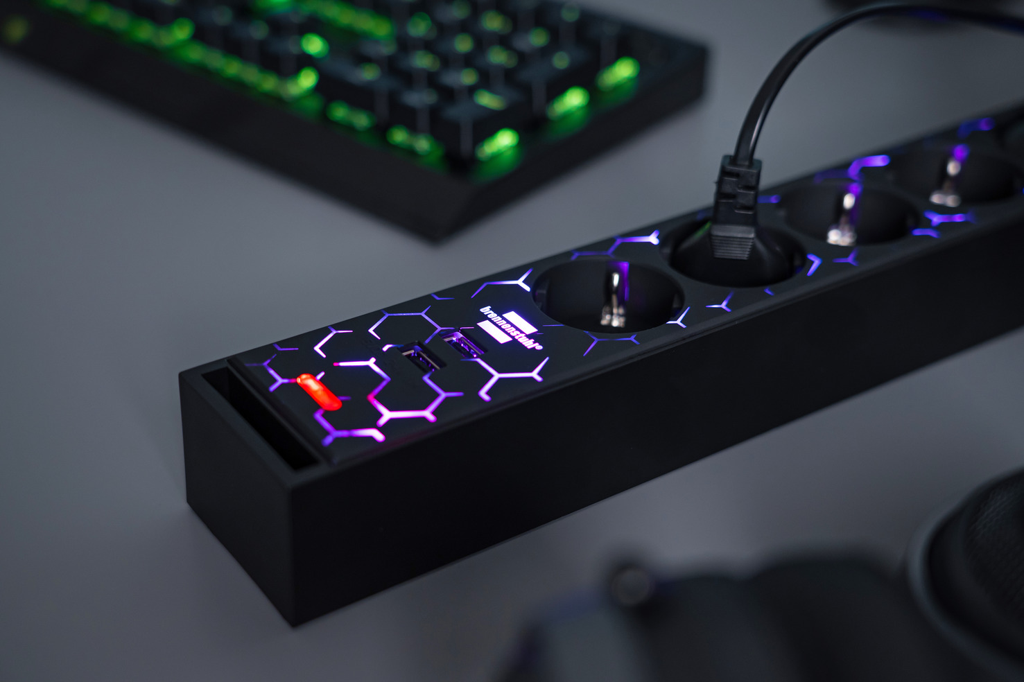 The GSL 05 USB gaming extension lead with LED lighting is the perfect power supply for your gaming setup. The 5-fold PC extension lead with 5 protective contact sockets and 2 USB charging busses offers enough space to power and charge devices such as PCs, game consoles, monitors, speakers but also smartphones or tablets and much more. Illuminated design socket strip with 5 different light colours and 8 different light functions - The LED technology in the stylish honeycomb design provides a special ambience and visually supports the gaming setup. Individual colours can be controlled or various automatic colour change modes can be activated at the touch of a button. Thanks to the practical memory function, the last selected colour is saved and directly reused the next time you use it. Thanks to the illuminated two-pole on/off switch, your appliances can be switched on or off with just one click. Only a two-pole switch offers the advantage that it completely interrupts the power circuit. This optimises power consumption and costs that arise from the standby operation of electronic devices.