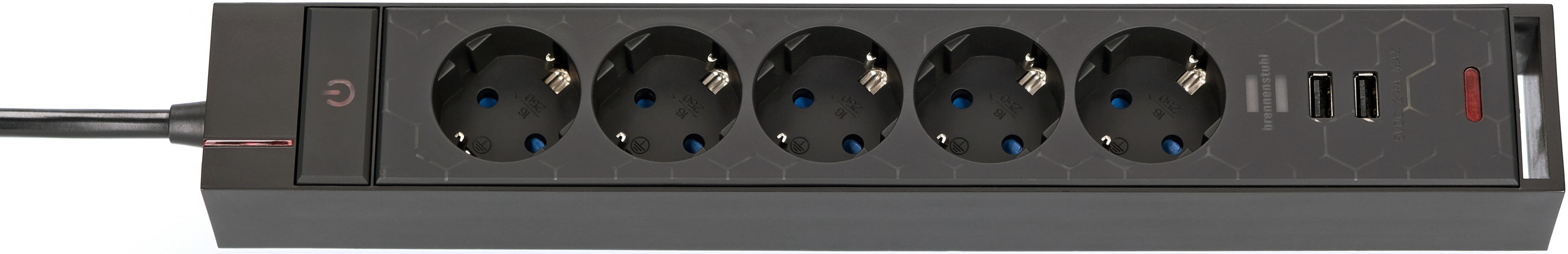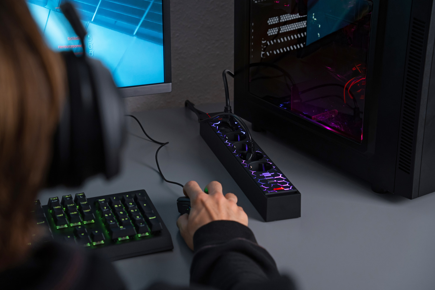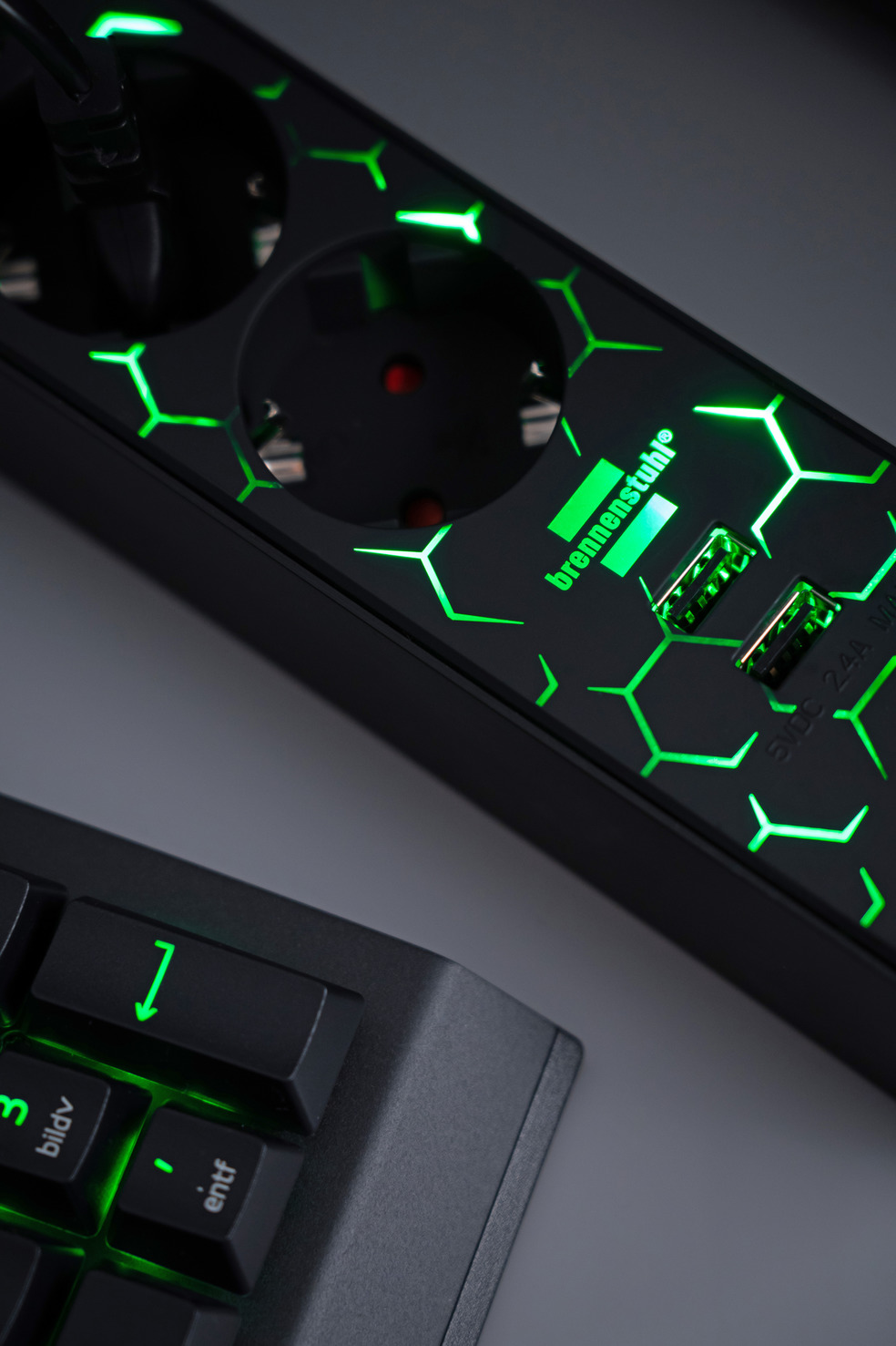 The GSL 05 USB gaming extension lead with LED lighting is the perfect power supply for your gaming setup. The 5-fold PC extension lead with 5 protective contact sockets and 2 USB charging busses offers enough space to power and charge devices such as PCs, game consoles, monitors, speakers but also smartphones or tablets and much more. Illuminated design socket strip with 5 different light colours and 8 different light functions - The LED technology in the stylish honeycomb design provides a special ambience and visually supports the gaming setup. Individual colours can be controlled or various automatic colour change modes can be activated at the touch of a button. Thanks to the practical memory function, the last selected colour is saved and directly reused the next time you use it. Thanks to the illuminated two-pole on/off switch, your appliances can be switched on or off with just one click. Only a two-pole switch offers the advantage that it completely interrupts the power circuit. This optimises power consumption and costs that arise from the standby operation of electronic devices.