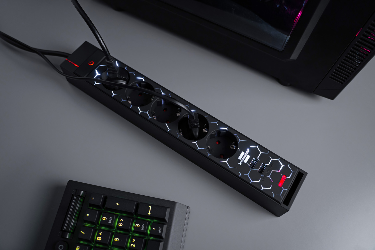 Gaming Power Strip GSL 05 USB with LED lighting and colour-changing mode (5-way illuminated design Extension Lead for gaming set-up)