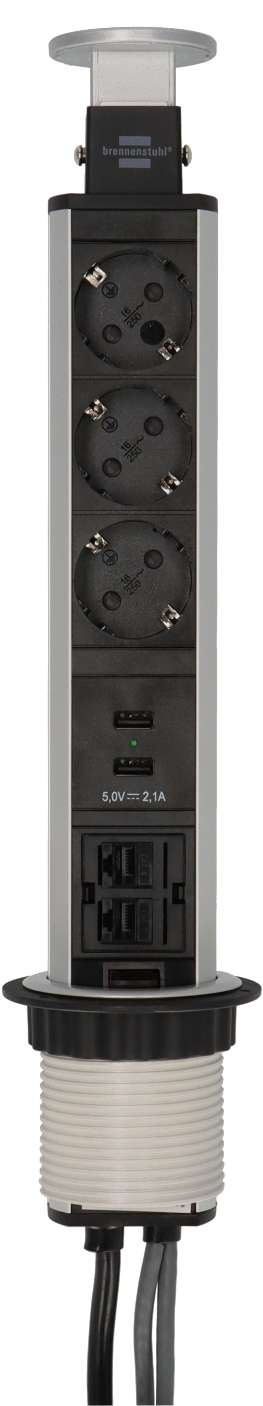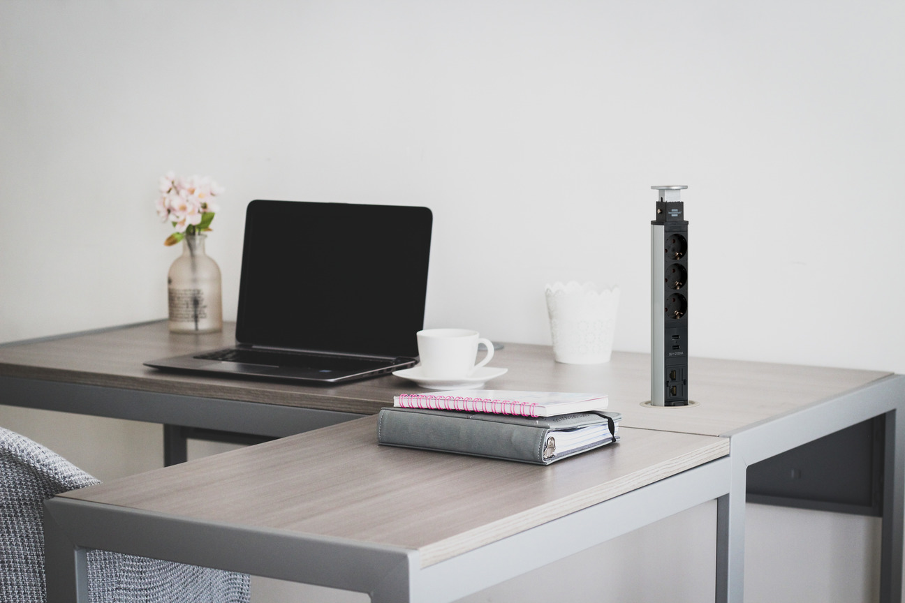 The Tower Power retractable table socket strip with 3 protective contact sockets, 2 USB charging sockets, 2x RJ45 sockets, 2m cable length and 2x2m data cable impresses with its quality and safety in all areas. In addition, it convinces druch the following features: