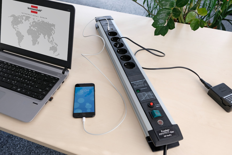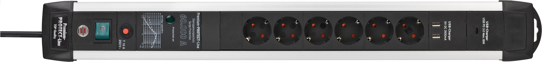 Premium-Protect-Line 60.000A Extension Lead with Surge Protection with Power Delivery USB-Charger 6-way 3m H05VV-F 3G1,5